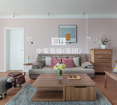 本案位于市中心,以方便老人照顾孩子为主;屋主还有大量的旧家具需要摆放,因此需要大量的储物空间,所以单独开辟了两个不同作用的储物间。整体设计也遵循简约、实用。 业主偏好浅粉色调,为了打造不油腻的粉色空间,挑选偏向自然色调的原木色地板以及原木色的防腐木。整个空间也是围绕灰色、粉色、木色这几种颜色来装饰,简洁不奢华! 客厅阳台光线很足,因此设计了落地窗,阳台立马变身阳光房,可以在这里看书、品茗、聊天、上网,这样就既可以每天都晒到太阳,又可以打发休闲时光。因为阳台挨着客厅,所以这样的设计既可以很好地利用空间,又让很多主人满足了晒太阳的生活需要。 进来卧室看看,卧室的墙面也跟客厅统一刷了粉色,再搭配粉色的窗帘,看起来舒适、简约。