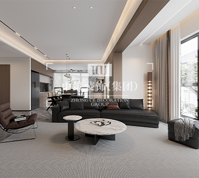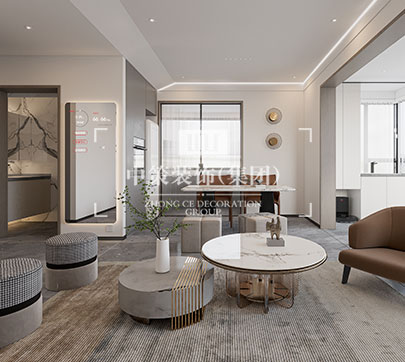 此户型居住人口为三人,在满足客户需求的前提下,其中书房打开,与客厅形成一个开放式的空间,每间主要卧室配备独立衣帽间,有独立的吧台!整体格调以新中式为主基调